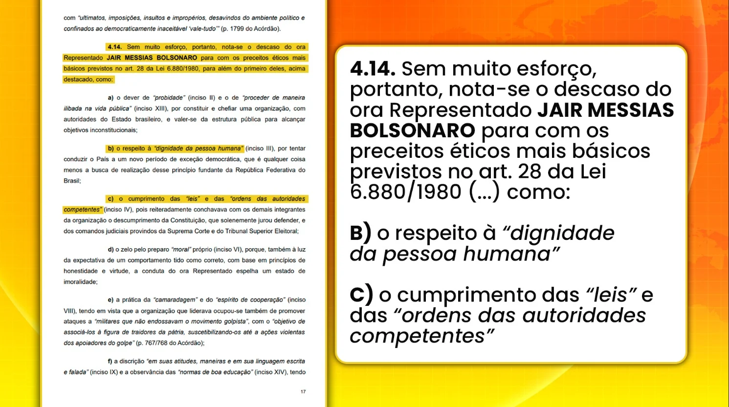 No primeiro eixo, a representação sustenta que Bolsonaro afrontou de forma direta o artigo 28 do Estatuto dos Militares (Lei nº 6.880/1980), dispositivo que reúne os fundamentos morais e éticos que devem nortear a atuação de integrantes da caserna. Segundo o documento, “sem muito esforço”, é possível constatar o desrespeito do representado a praticamente todos esses preceitos.