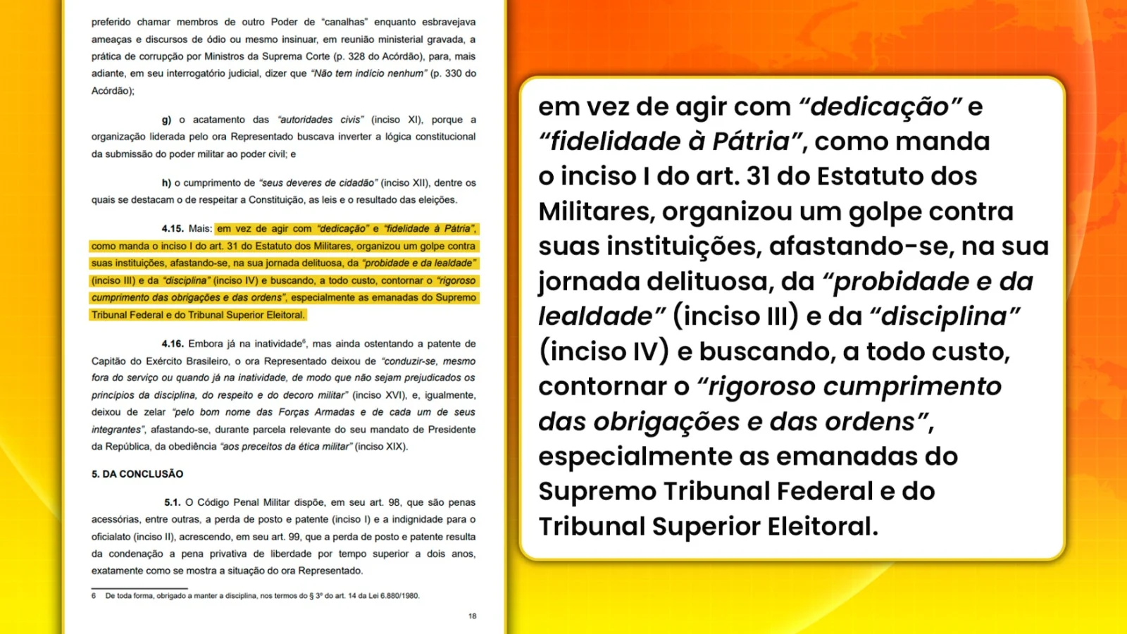 Na parte final da peça, o Ministério Público Militar conclui que, em vez de agir com dedicação e fidelidade à Pátria, como exige o Estatuto dos Militares, Bolsonaro organizou um golpe contra as próprias instituições do país. Para o órgão, essa trajetória afasta o ex-presidente da probidade, da lealdade e da disciplina que sustentam a credibilidade das Forças Armadas e fundamentam o pedido de declaração de indignidade para o oficialato.