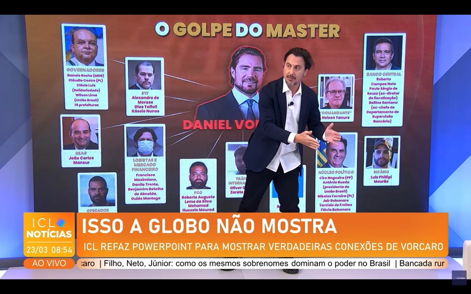 Como resposta, o jornalista apresentou uma nova versão do PowerPoint exibido pela emissora, reorganizando os personagens com base, segundo ele, em informações de investigações e reportagens.
